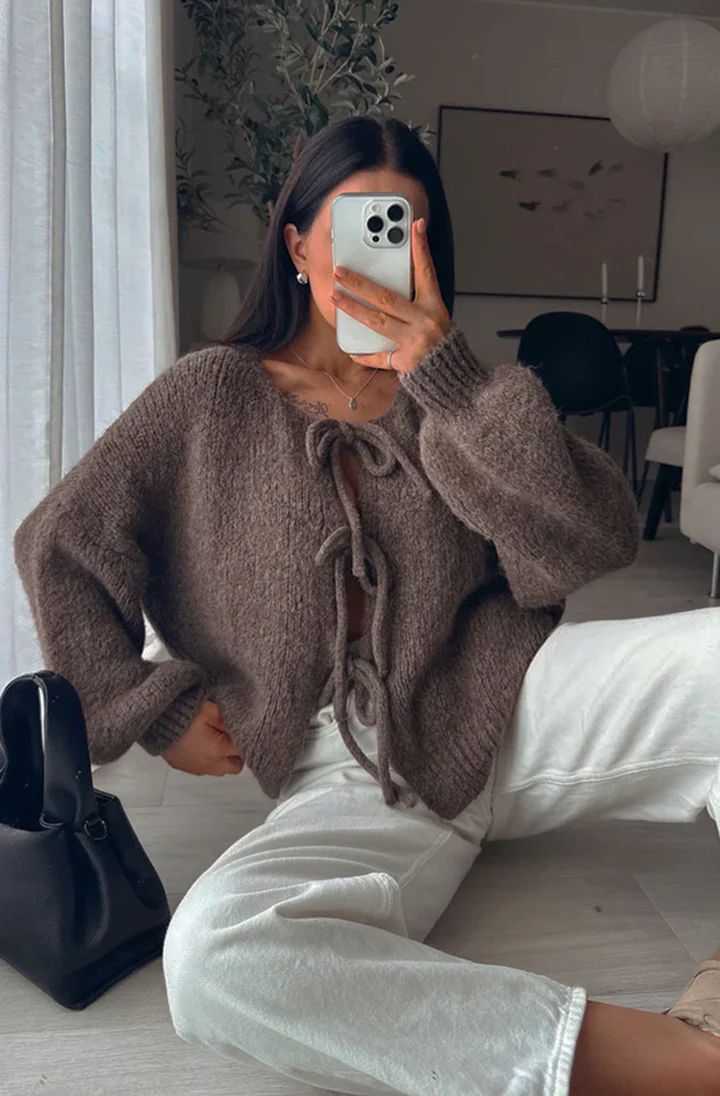 Unser Schnürcardigan Amalya ist jetzt in braun erhältlich. Mit seiner weichen Textur, den Schnüren auf der Vorderseite und dem luxuriösen Boutique-Charakter ist diese Strickjacke die erste Wahl, in die du dich verlieben wirst.